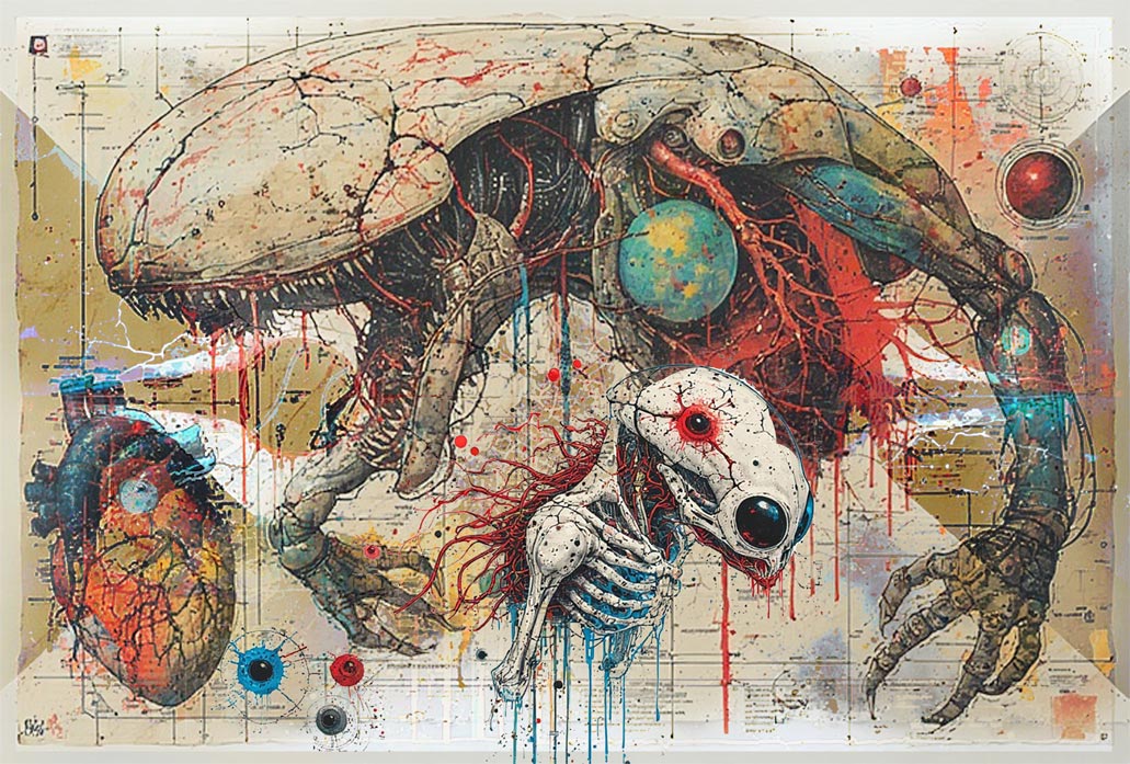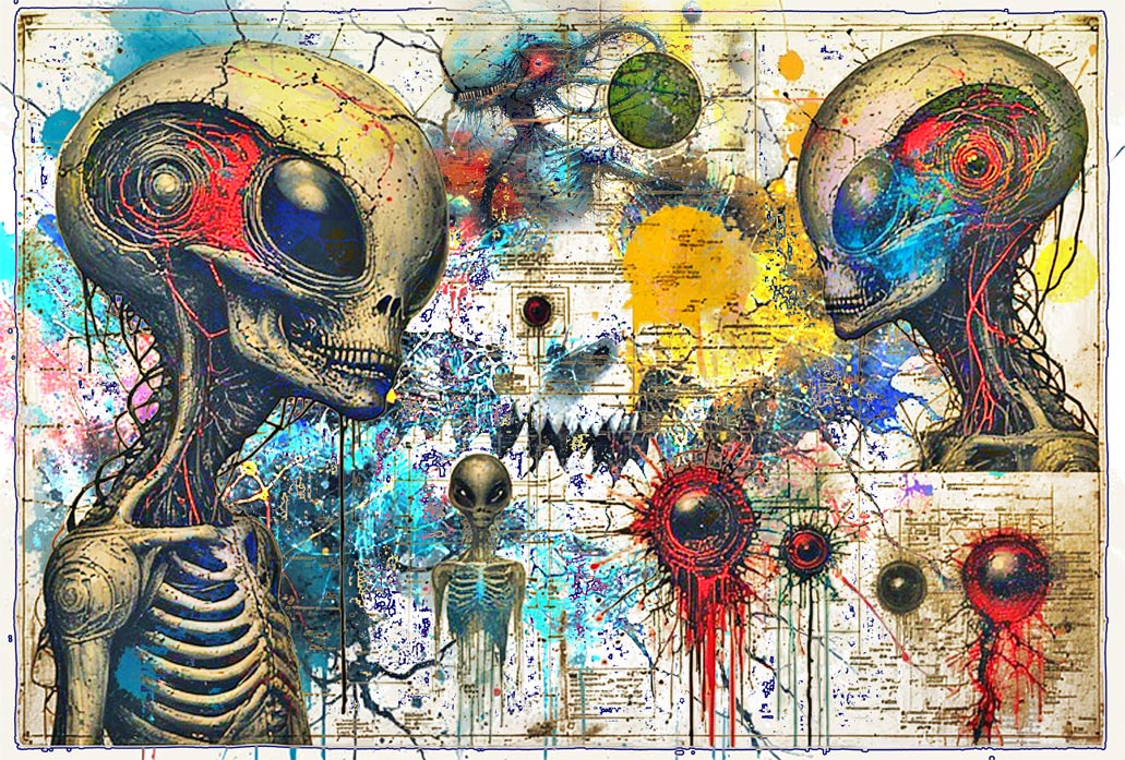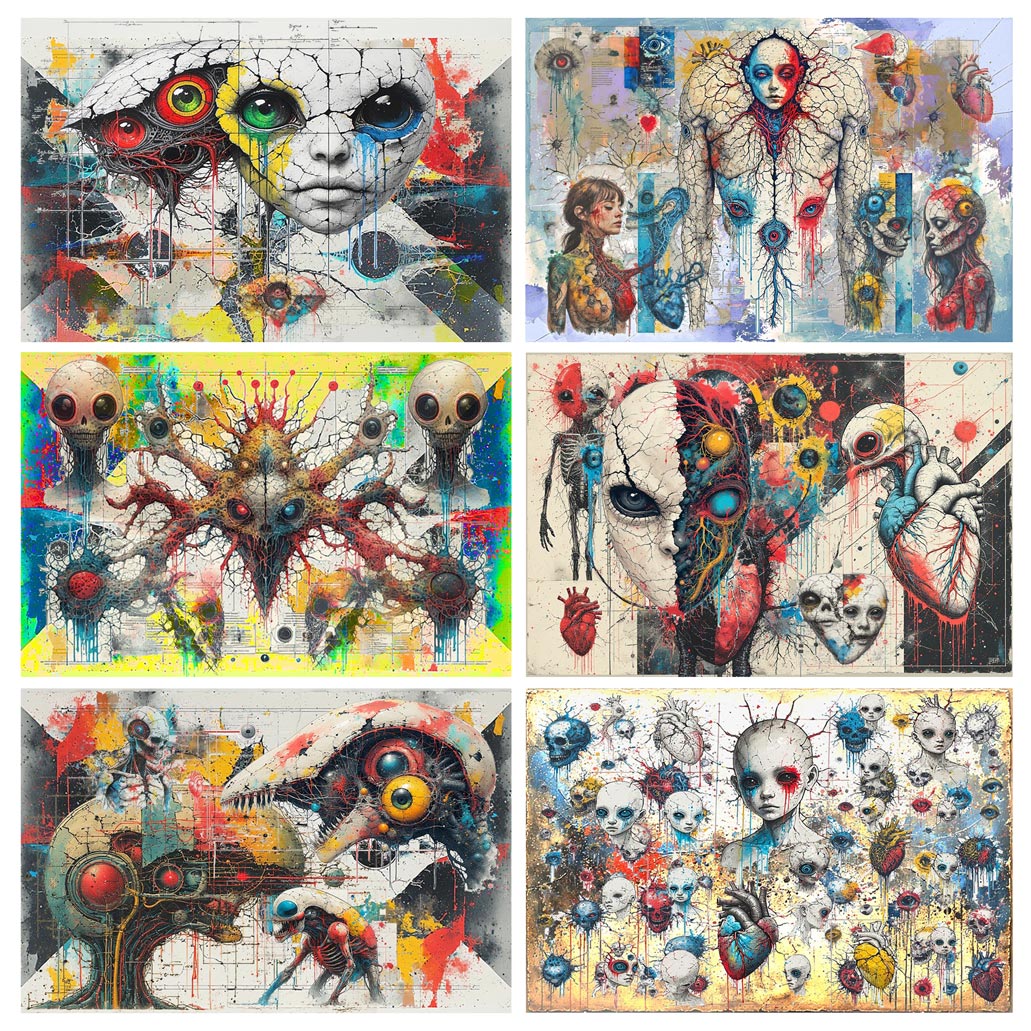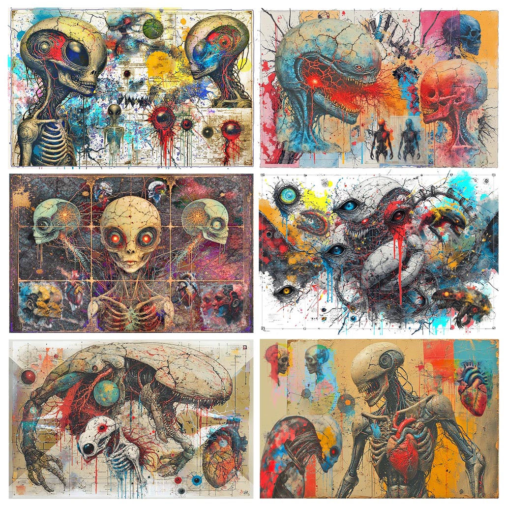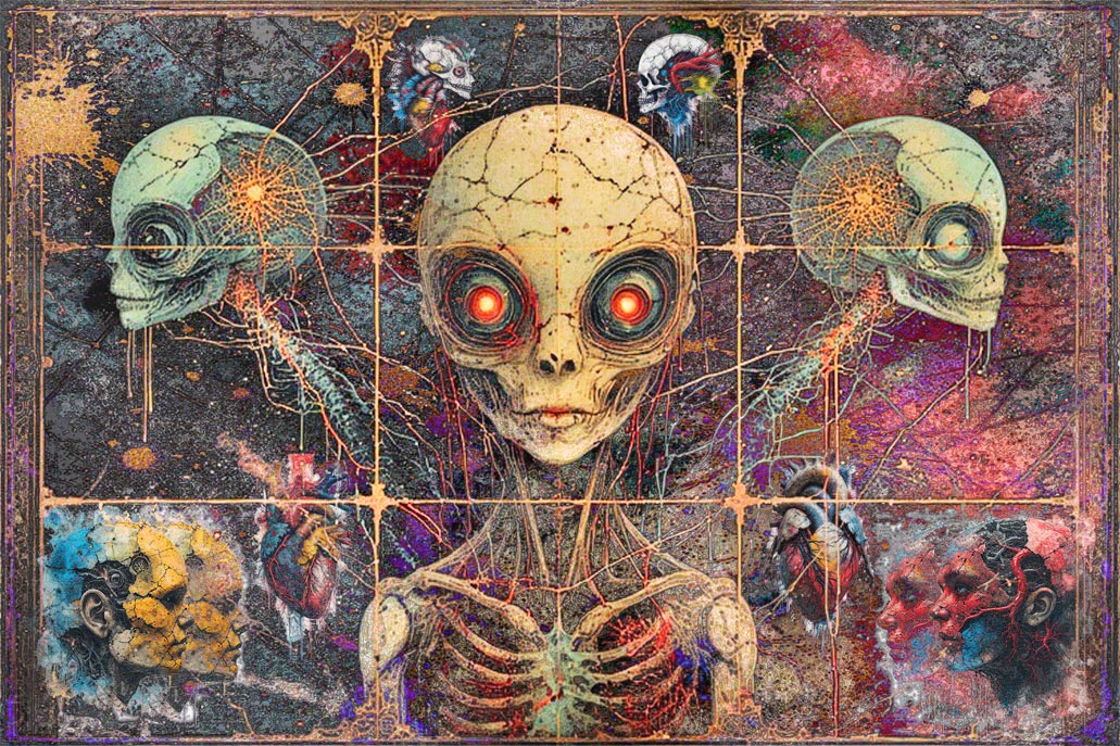 Step into the world of the Mutant Genome Mint collectible archive, a treasure trove of unique and constantly changing emotional relics. Traditional human figures are transformed into surreal Alien abstractions in this collection, creating a diverse series of visual representations that repeat throughout.